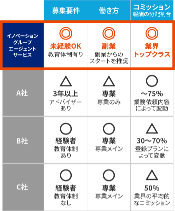イノベーショングループエージェントサービスのコミッション率は業界トップクラス。他社の不動産エージェントのコミッション率よりも高い割合となっています。