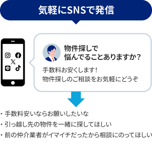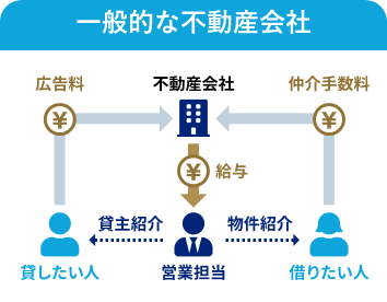 不動産エージェントは仲介⼿数料を⾃分で自由に設定できるため不動産会社より柔軟な価格設定ができ、仲介手数料の面でお客様に選ばれやすいことが特徴です。