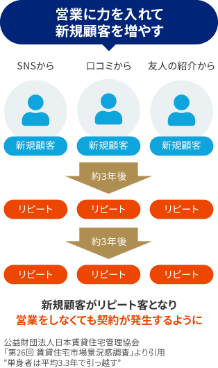 不動産エージェントはお客様からのリピート率が⾼いため、新規顧客をどんどん増やすことで将来的には営業をしなくても契約が発⽣するサイクルが作れます。