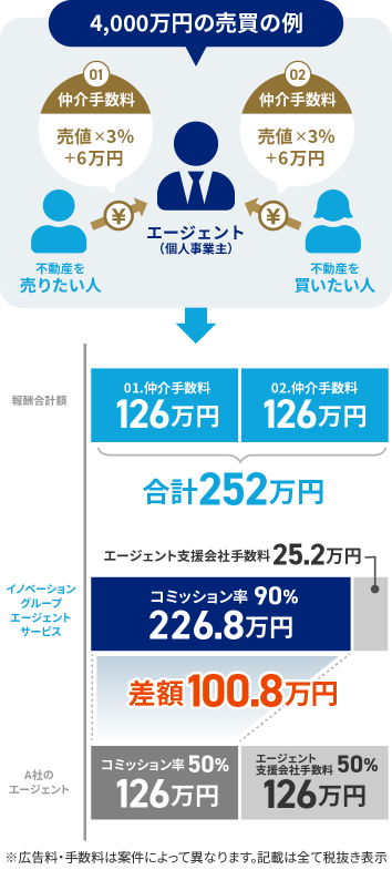 不動産会社で営業として働いていた場合、仲介⼿数料の⼤半が会社に⼊ります。 エージェントは個⼈事業主(業務委託契約)なので、不動産会社を介さずに取引をおこない、仲介⼿数料をすべて受け取れます。